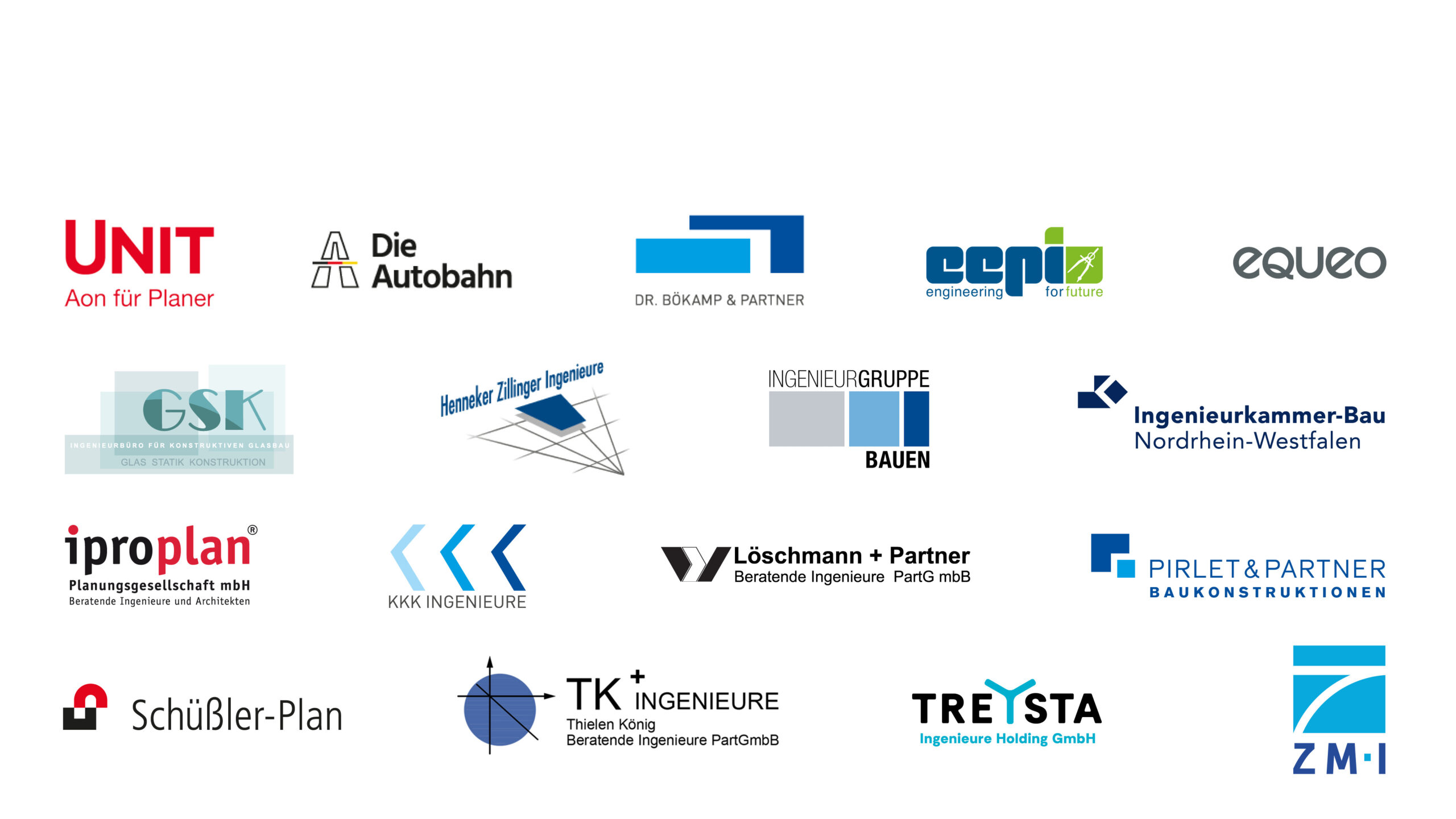 AON, Autobahn des Bundes, Dr. Bökamp & Partner, eepi, equeo, GSK Glas Statik Konstruktion GmbH, Henneker Zillinger Beratende Ingenieure PartG mbB, IK NRW, Ingenieurgruppe Bauen, iproplan, KKK – Ingenieurgesellschaft, Löschmann + Partner, Pirlet & Partner Ingenieurgesellschaft mbH, Schüßler-Plan, Thielen König PartGmbB, Treysta und ZM-I.
