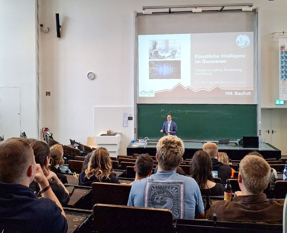 Den inhaltlichen Auftakt bildete ein Impulsvortrag von Prof. Dr.-Ing. Michael Kraus zum Thema „Künstliche Intelligenz im Bauwesen – Thesen für Lehre, Forschung und Praxis“. Im Anschluss kamen Studierende und Vertreterinnen der Bayerischen Ingenieurekammer-Bau beim Meet-up in entspannter Atmosphäre ins Gespräch – eine wertvolle Gelegenheit, um Fragen zur beruflichen Praxis und zur Rolle von Kammern und Verbänden zu diskutieren.